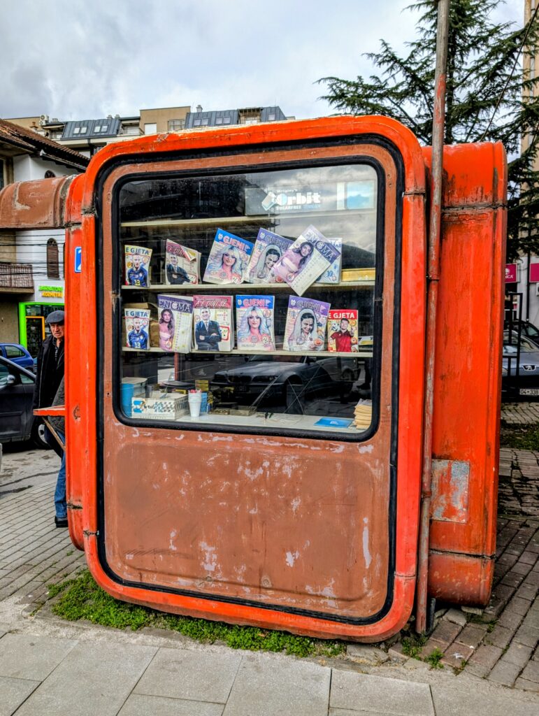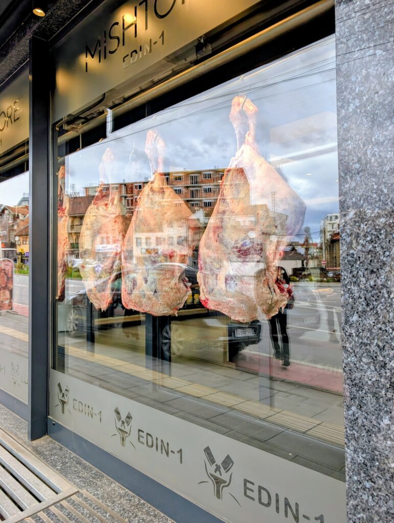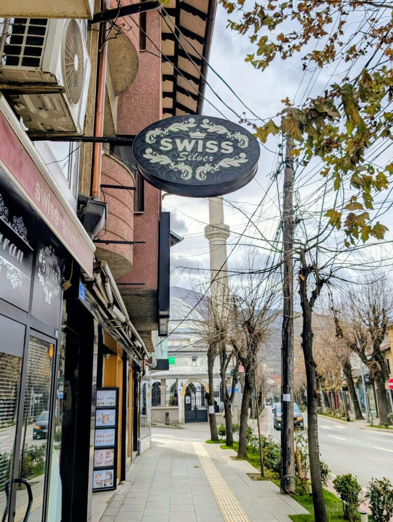 Nous traversons le coeur de la ville, marchons jusqu’au bazar dont les échoppes vendent soit des contrefaçons de sacs, chaussures et vêtements soit des bijoux en or et argent. On se croirait plus en Turquie qu’au Kosovo. Et que dire des bâtiments : bon nombre sont en ruine ou complètement décrépis. Même les mannequins dans les vitrines quasiment vides semblent vouloir se barrer 😉 Bref, je ne sais pas si c’est à cause de ce temps maussade, mais nous ne sommes absolument pas sous le charme. Nous nous arrêtons manger dans un joli resto qui était recommandé sur l’un des sites que j’avais consulté. Mais ce n’est qu’une fois assis que nous constatons qu’il propose une cuisine méditerranéenne et non locale. Nous avons bien mangé mais nous aurions aimé goûter à la cuisine kosovar qui semble réputée. Ca sera pour une autre fois.