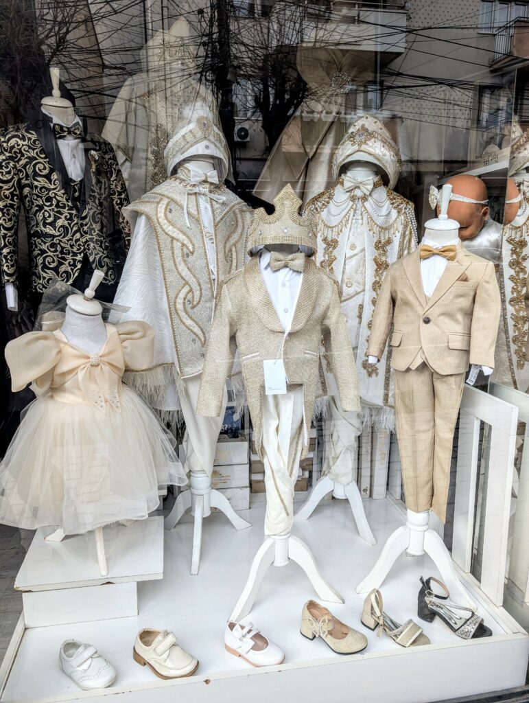 Dimanche 4 janvier, nous partons à la découverte de ce que les gens appellent « la plus belle ville du Kosovo ». Nous descendons l’artère principale de la ville et découvrons avec étonnement les innombrables boutiques de robes de mariées toutes plus spectaculaires et étincelantes les unes que les autres alignées à côté de nombreuses bijouteries. Une vraie industrie autour du mariage !