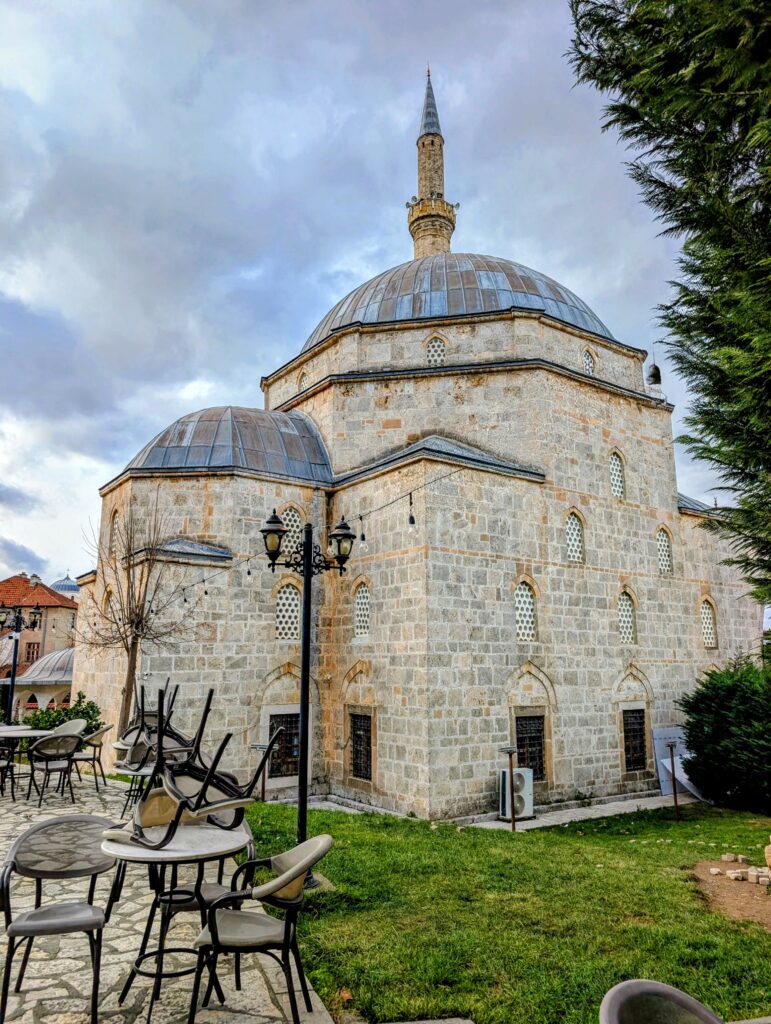 Nous arrivons au coeur de la ville et sommes tout de suite sous le charme des lieux et de l’atmosphère qui y règne. Avec la température plutôt douce et quelques rayons de soleil, de nombreuses personnes boivent un verre en terrasse. Nous traversons le vieux pont en pierre, admirons la place centrale et la magnifique mosquée. L’ambiance est festive et les toutous errants, tous pucés d’ailleurs, sont très sympas.
