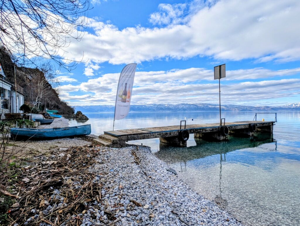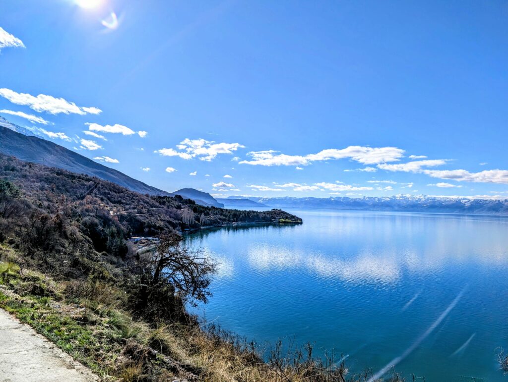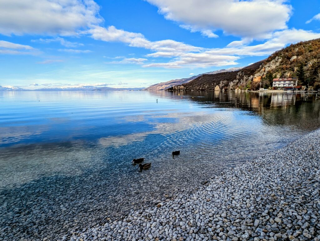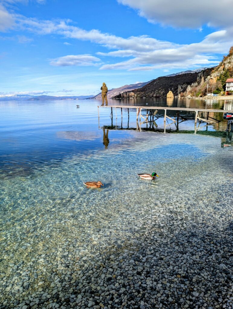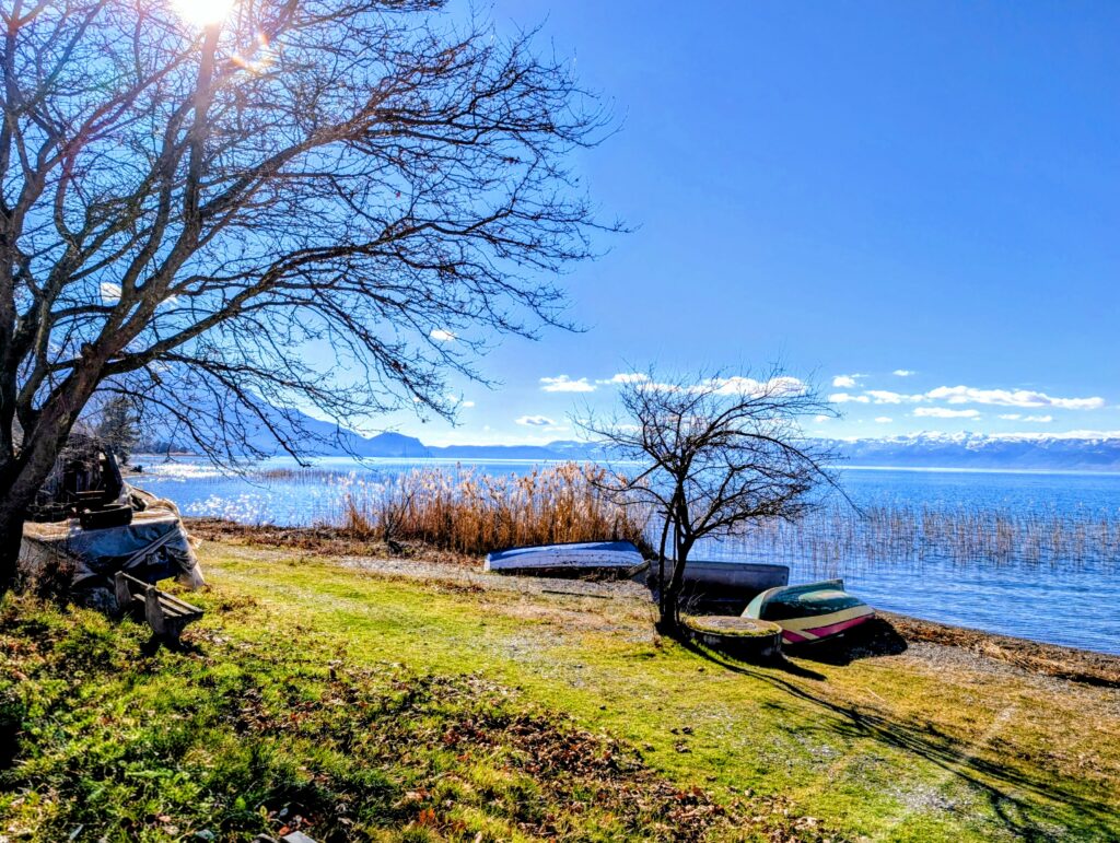 Mardi 13 janvier, nous profitons de chiller un peu durant la journée. Malgré mon rhume tenace, nous décidons de tenter une petite baignade dans ce fameux lac partagé entre l’Albanie et la Macédoine du Nord. Les 4 petits degrés ont leur effet rafraîchissant, surtout à la sortie avec le léger vent.