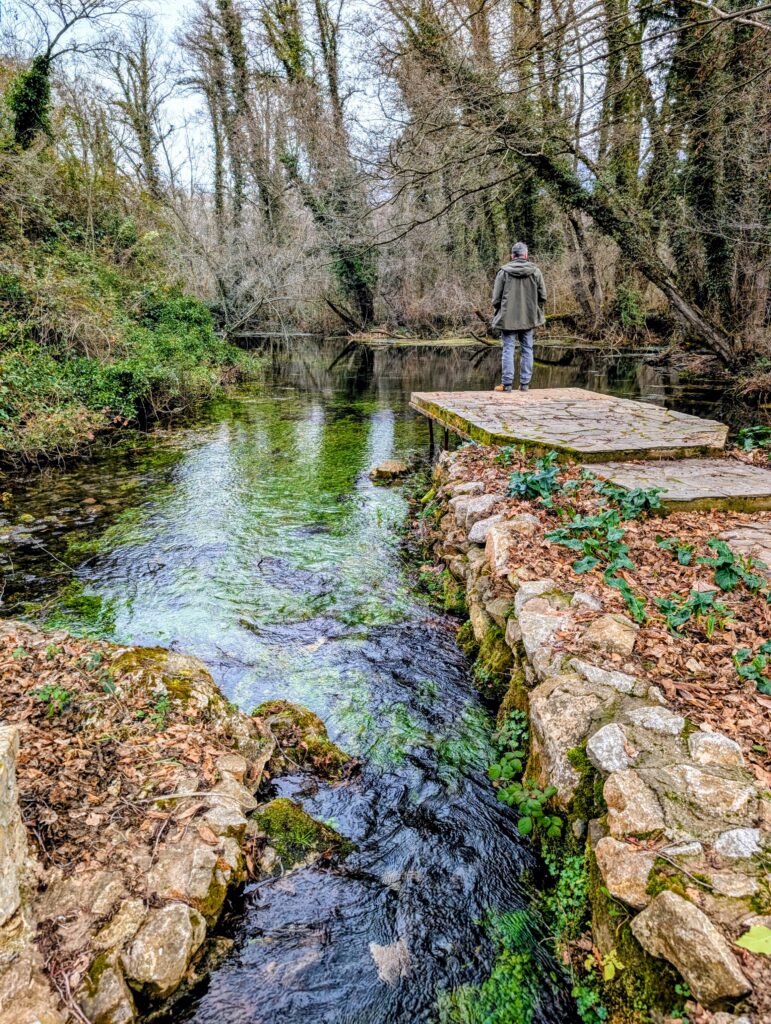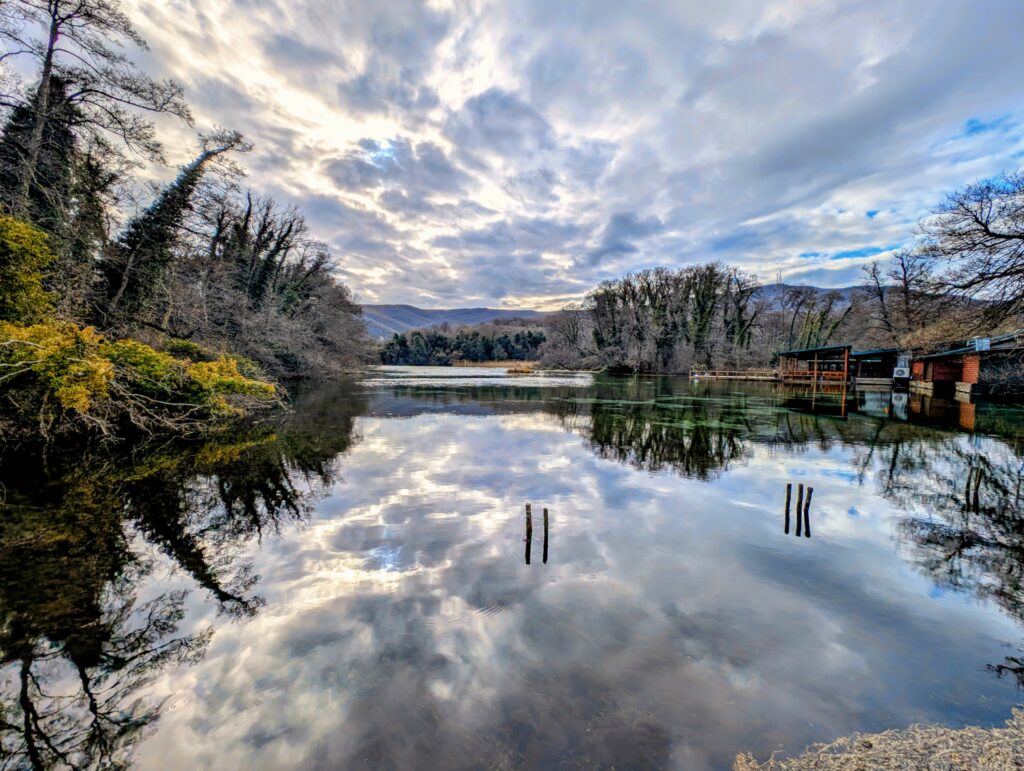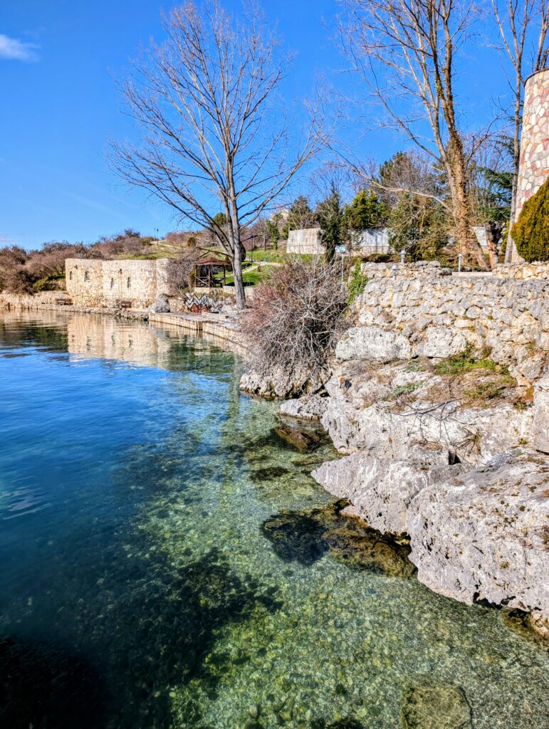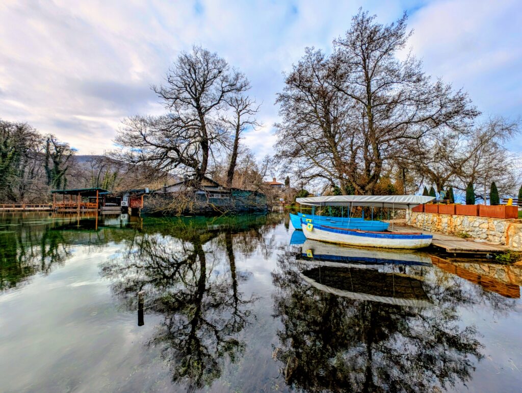 Nous marchons à travers le beau parc qui offre une vue imprenable sur les monts Galičica enneigés puis admirons le panorama sur le lac d’Ohrid depuis le Monastère. Nous faisons ensuite une jolie balade le long de la rivière du Drin noir qui prend sa source ici. L’été, des bateaux à rame emmènent les touristes découvrir ses eaux cristallines.