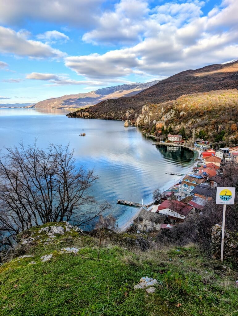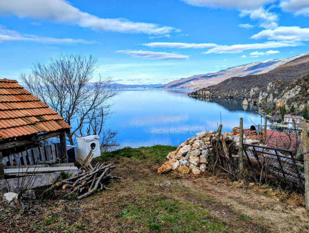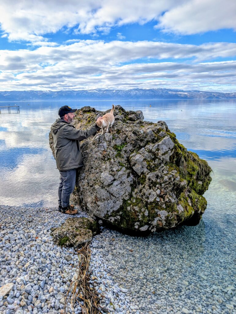 Dans l’après-midi, nous décidons de nous arrêter dans le village de Trpejca et de trouver un resto ouvert pour manger une morce. J’ai trouvé un joli spot pour cette nuit sur les hauts du village. Nous croisons quelques locaux humains sympathiques et descendons jusqu’au bord du lac. Quelle vue époustouflante ! Si nous sommes accueillis par quelques chiens et chats très amicaux, aucun resto ouvert à l’horizon. Tant pis, ce sera « salade grecque » dans Gru.