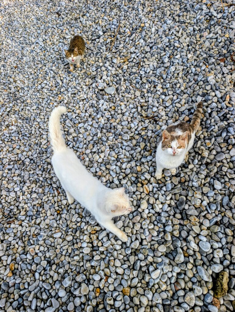 A notre arrivée, 2 gentils chats, une maman et son petit, ne nous ont plus lâchés d’une semelle et nous avons passé un chouette moment en leur compagnie. Quelques croquettes et un petit tour dans Gru aident toujours à briser la glace.