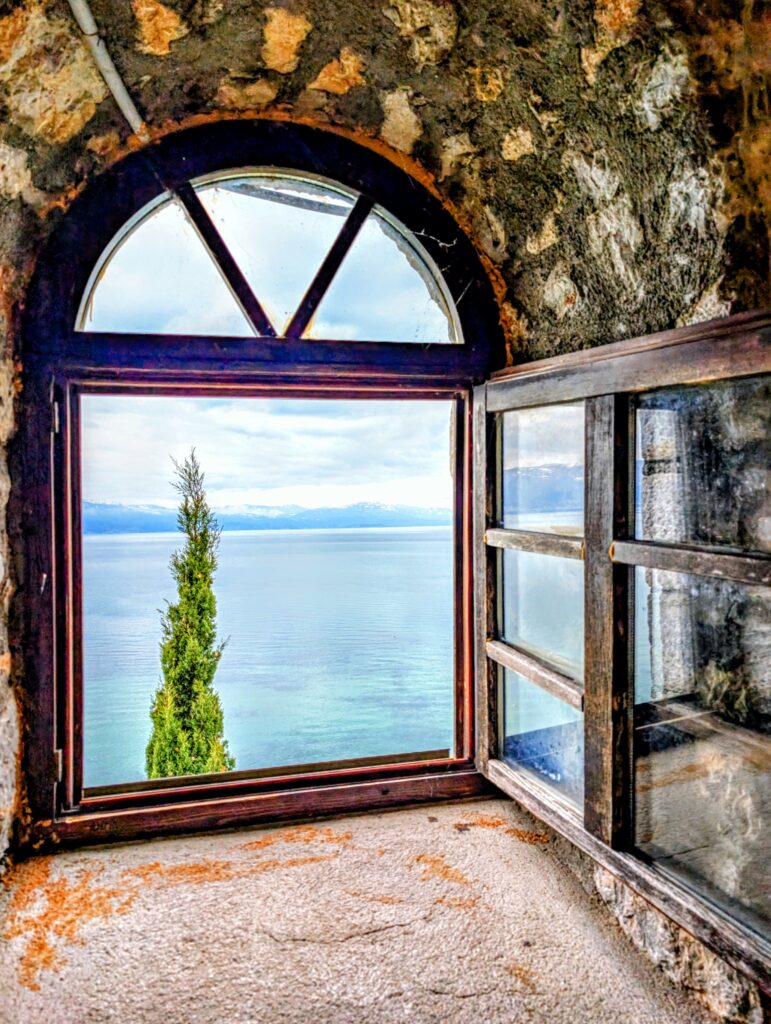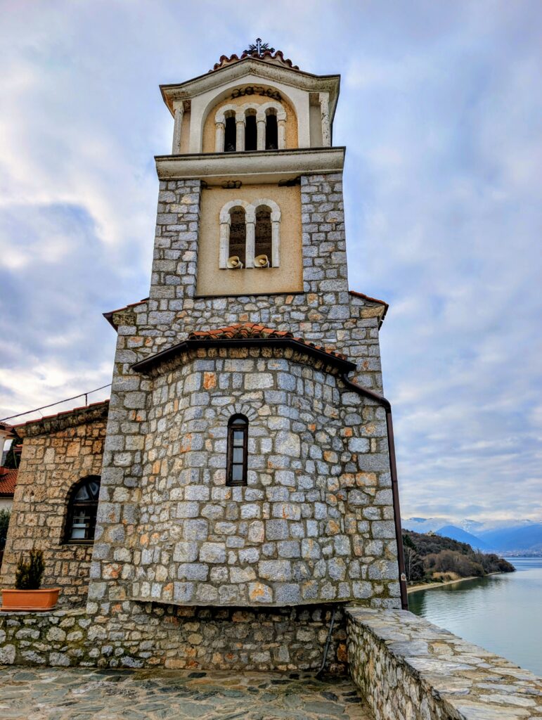 Nous longeons la côte par un joli sentier qui offre de magnifiques points de vue sur le lac et les montagnes enneigées. C’est superbe ! Nous arrivons ensuite à l’Eglise orthodoxe Saint-Jean de Kaneo, l’un des édifices les plus célèbres et les plus emblématiques de la Macédoine du Nord, grâce à sa beauté architecturale et à sa situation pittoresque. Elle a été construite au 13e siècle sur un promontoire rocheux qui domine le lac d’Ohrid et elle n’est accessible qu’à pied.