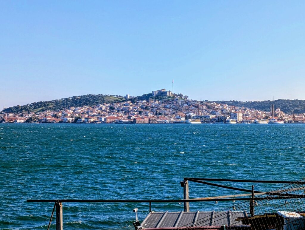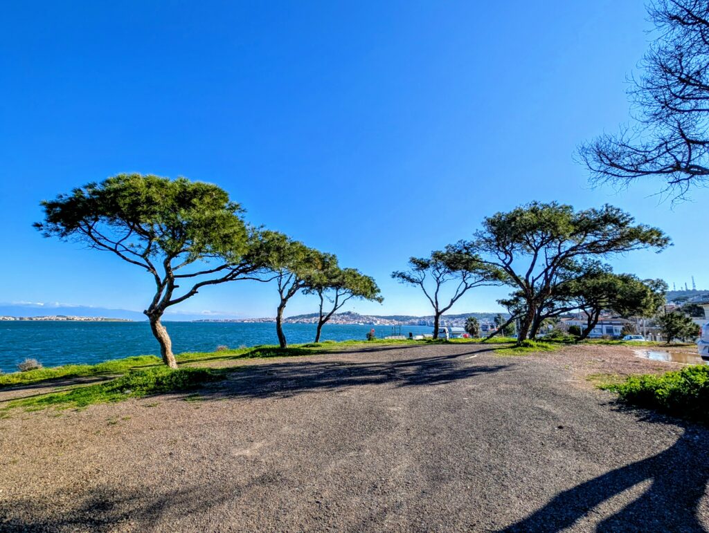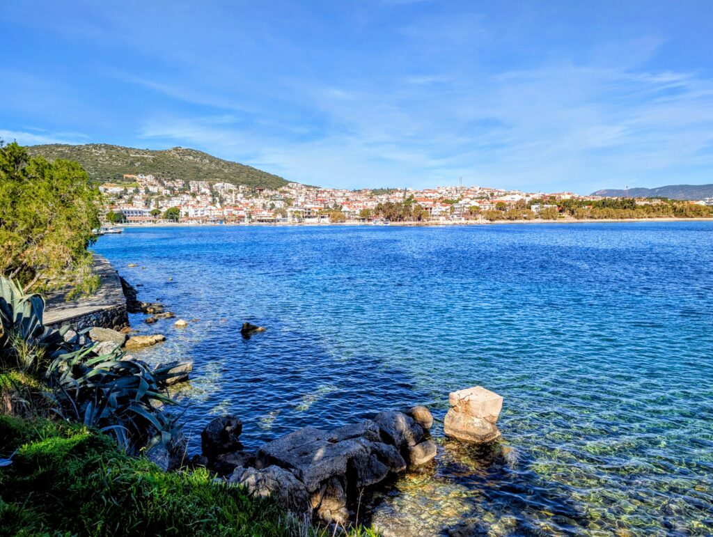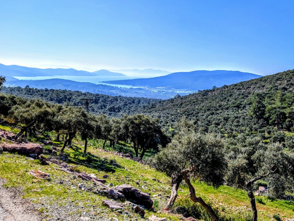 Dimanche 22 février, après avoir avalé plus de 300 kilomètres, nous nous arrêtons dans la ville d’Ayvalik, sur un parking en bord de mer. Nous avons roulé une grande partie du trajet sur la Départementale qui offre de jolis points de vue sur la mer. Que ça fait du bien de voir le soleil et ces nouveaux paysages ! L’état des routes est tout à fait correct et les turcs sont plutôt courtois au volant.