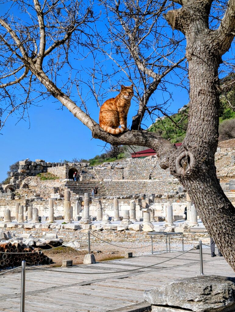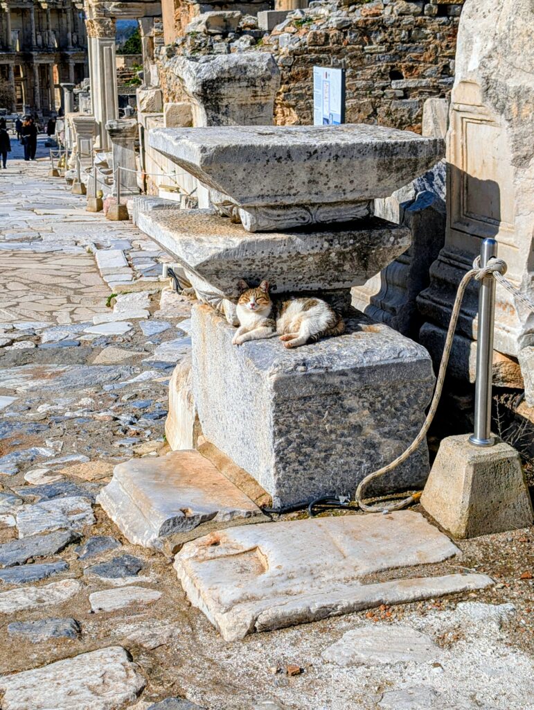 Lundi 23 février, nous arrivons sur le site archéologique. Ephèse était une ville de la Grèce antique, située sur la côte de l’Ionie. Dans les temps anciens, la ville était située directement sur la mer. En raison de la sédimentation et des changements climatiques et sismiques, le littoral s’est déplacé vers l’ouest au fil du temps, si bien que les vestiges de la ville se trouvent désormais à plus de 9 kilomètres à l’intérieur des terres.