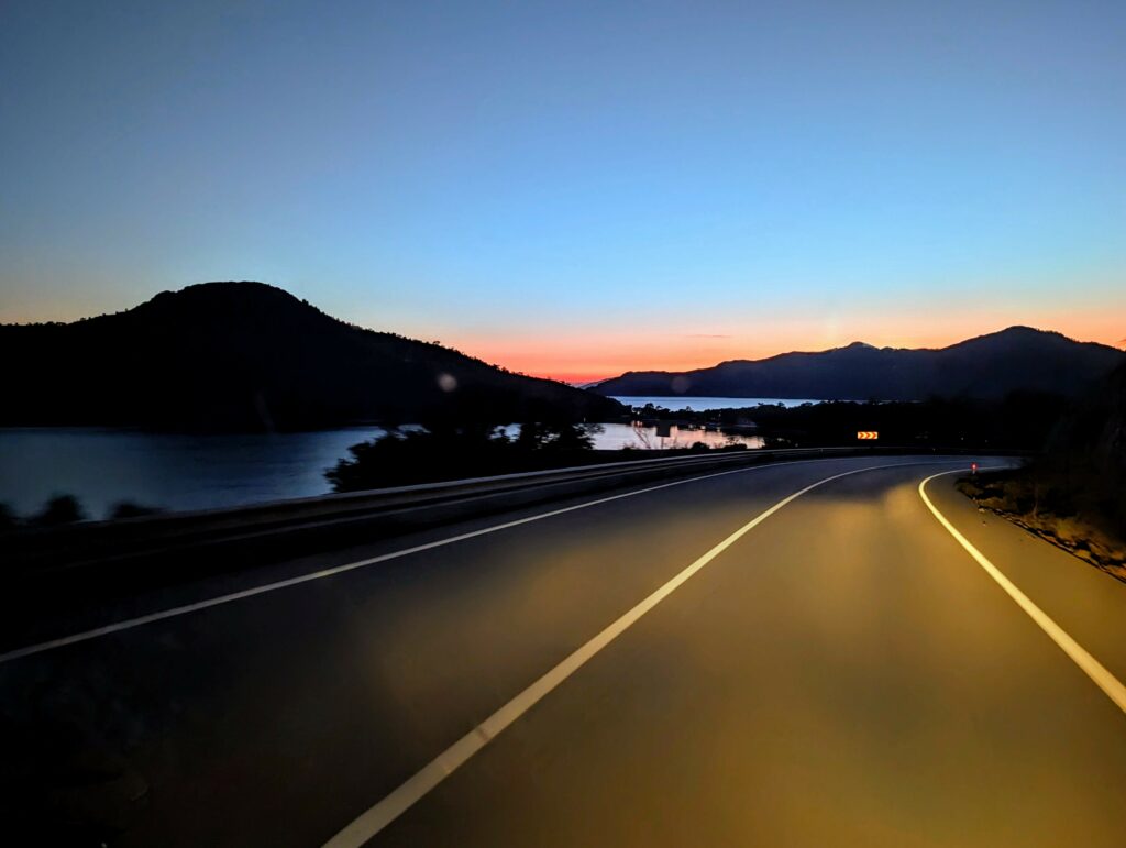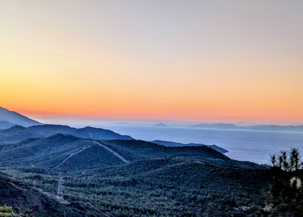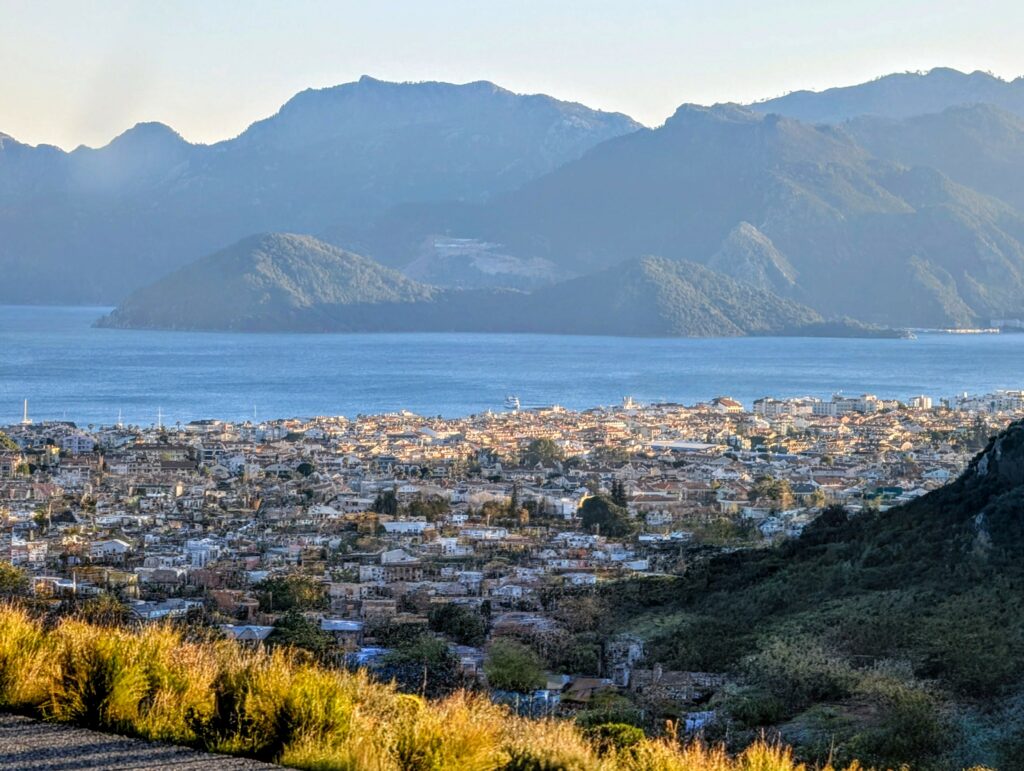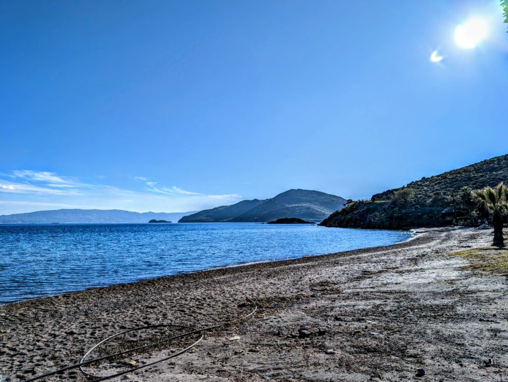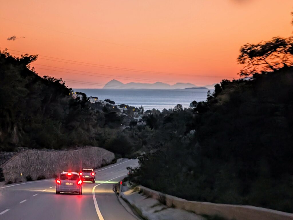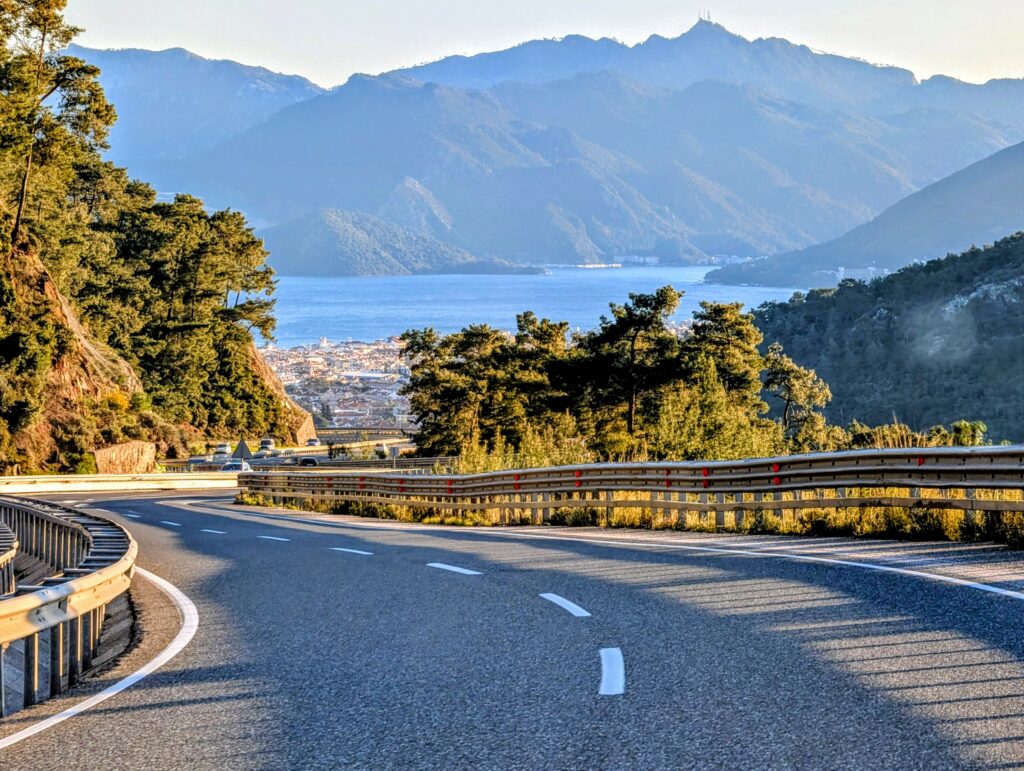 Ce soir et demain, nous avons prévu de dormir dans la petite ville de Datça sur la presqu’île du même nom. La route qui nous amène à destination est superbe et nous profitons un superbe coucher de soleil sur la mer et les collines boisées. Une nature brut et sauvage !