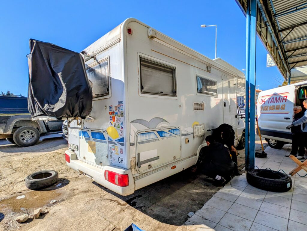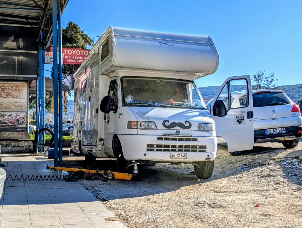 Nous roulons jusqu’à Muğla et décidons de nous arrêter dans un garage pour changer 2 pneus qui commencent à manquer de relief. Comme nous allons en Cappadoce, région qui se situe à 1’000 mètres d’altitude et qu’il y neige ces jours, nous préférons avoir des pneus neufs. Nous trouvons un premier garage mais l’accès n’est vraiment pas trop et surtout les gars ne parlent pas un mot d’anglais. Nous poursuivons notre chemin et tentons notre chance dans un deuxième garage. Un des turcs parlent un peu anglais et décide de nous prendre sous son aile. Depuis notre arrivée en Turquie, nous avons tout de suite été séduits par la gentillesse et le côté très amical des locaux.
