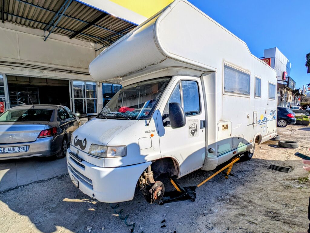 Comme le type est vraiment sympa, nous lui demandons s’il connaît un endroit où acheter un nouveau tapis de sol pour le poste de pilotage car le nôtre est complètement cuit. Il fait quelques téléphones et une fois que nos pneus sont changés, nous le suivons jusqu’à un magasin d’accessoires automobiles à quelques kilomètres du garage. Et aussi incroyable que cela puisse paraître, le proprio part fouiller au fond de son stock et nous trouve un tapis de sol pour Fiat Ducato qui va parfaitement. Salut l’ami et un énorme merci pour ton aide et ta gentillesse ! Nous reprenons la route avec 2 bonnes heures de retard sur notre planning initial mais avec 4 pneus neufs.