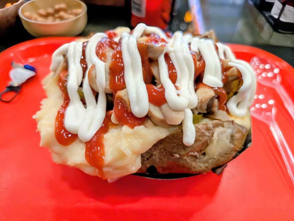 J’ai trouvé un spot sympa sur une petite presqu’île et nous nous y parquons. Nous sommes morts de faim et bien crevés alors nous rentrons dans le premier bistrot pas trop mal noté. Même si l’endroit est un fast-food un peu glauque fréquenté par quelques locaux qui fument à l’intérieur, nous sommes bien accueillis et on nous sert avec le sourire. La spécialité du lieu, une grosse patate farcie avec les aliments de notre choix. Pas de la grande cuisine, mais ça fera l’affaire pour ce soir.